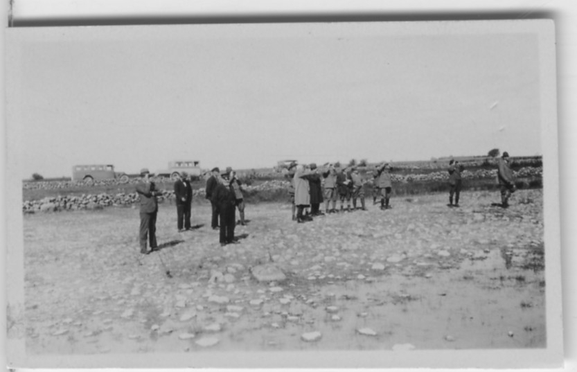 'Biologiska föreningens utfärd till Öland. :: :: Text enligt foto: ''Petgärde träsk.'' Gruppen, ca 14 st män, en del med kikare. Stenmurar och 2 st bussar i bakgrunden. Stengärdesgård. :: :: Se även fotonr. 2607-2625, 2583-2606 samt 2883-2911 från samma utfärd.'
