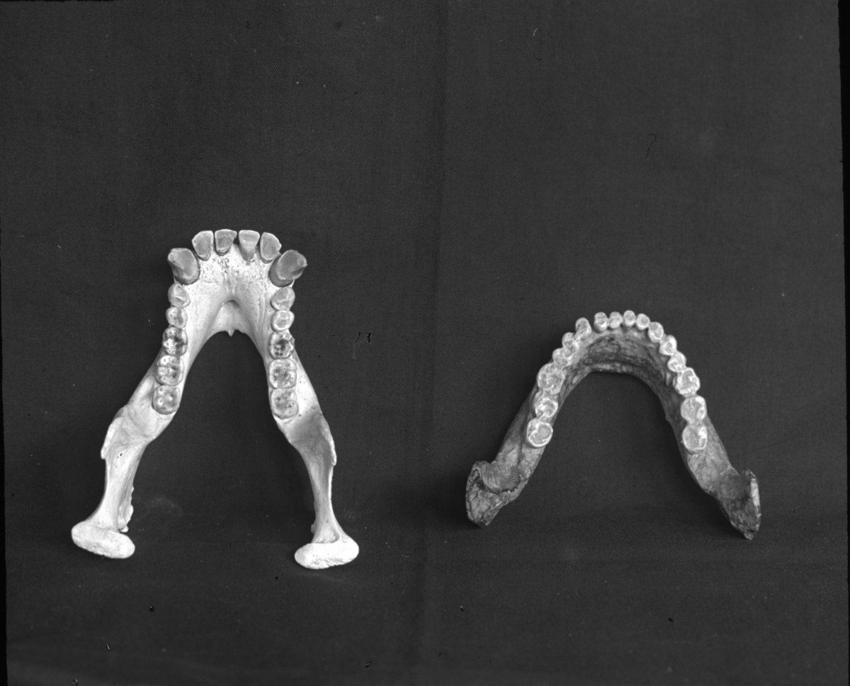 'Bildtext: ''Pan chimpanse (Meyer), Homo neanderthal. (mandib.)'' 2 käkbågar (mandibularbågar) från schimpans till vänster och neandertalmänniskan till höger. Bilden numrerad II.A. Nr. 15. :: :: Ingår i serie med fotonr. 5376:1-20, bilder från Dr. Schlüter & Mass naturvetenskapliga läromedel, Halle a S. Serie II.A. Nr 1-20. Se även hela fotoserien 5374-5376.'