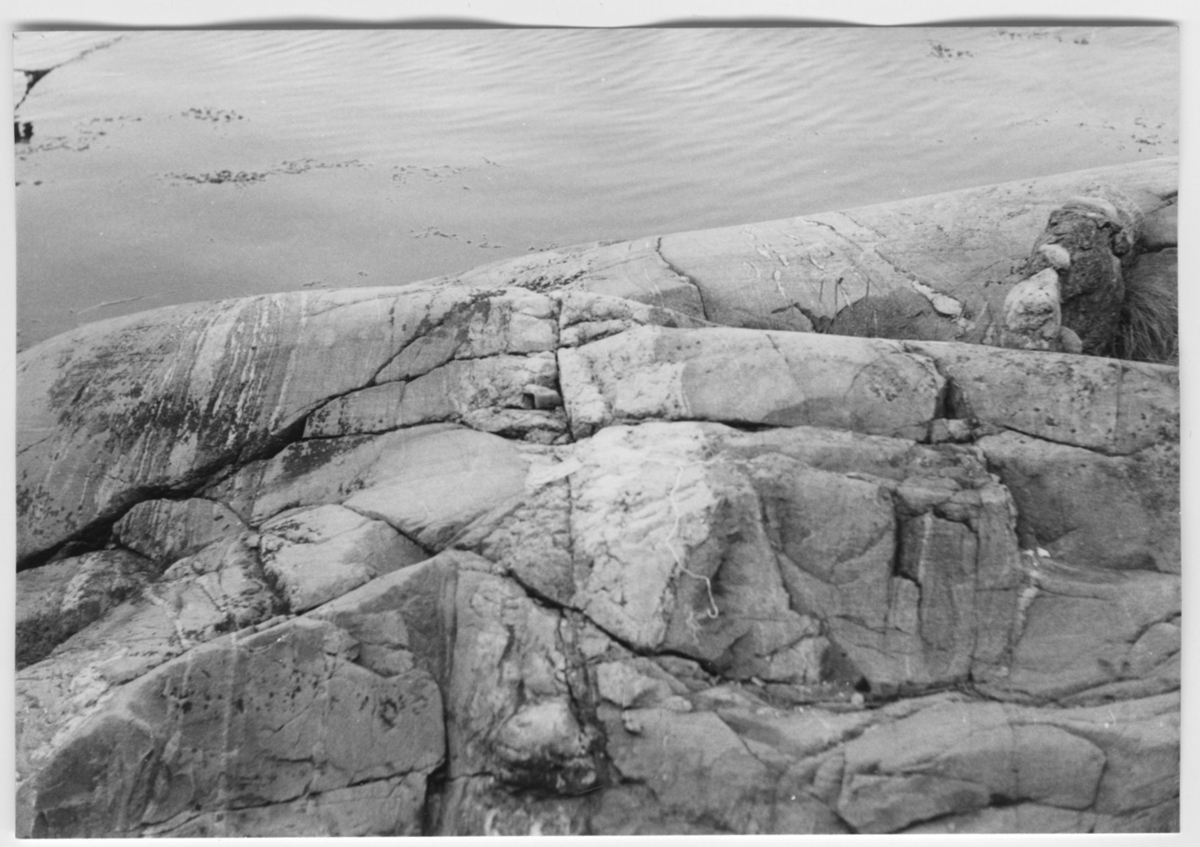 'Bildtext: ''Pegmatitgång.'' Närbild på bergshäll. :: :: Ingår i serie med fotonr. 6970:1-1125, dokumentation av Hisingens naturgeografi, visande landskapsformerna i stora drag och gjord inför exploateringen av området. Platserna för fotograferingen finns utsatta på karta i skala 1:4000 som finns på Göteborgs Naturhistoriska musem. Fotoriktningen mättes med kompass i gammalgrader.'