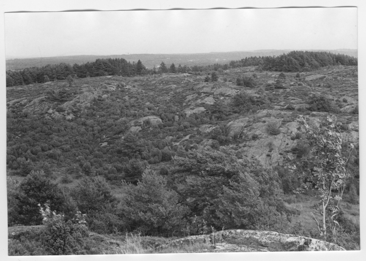 'Bildtext: ''Vy över hällparti. Skog i sprickorna. Riktning 80.'' :: :: Ingår i serie med fotonr. 6970:1-1125, dokumentation av Hisingens naturgeografi, visande landskapsformerna i stora drag och gjord inför exploateringen av området. Platserna för fotograferingen finns utsatta på karta i skala 1:4000 som finns på Göteborgs Naturhistoriska musem. Fotoriktningen mättes med kompass i gammalgrader.'