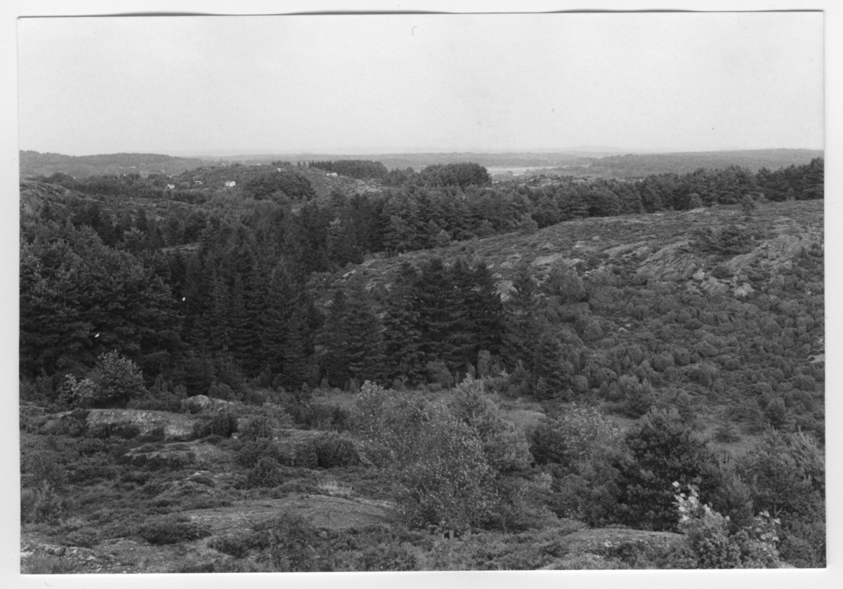 'Bildtext: ''Vy över hällparti. Skog i sprickorna. Riktning 56.'' Granvegetation. :: :: Ingår i serie med fotonr. 6970:1-1125, dokumentation av Hisingens naturgeografi, visande landskapsformerna i stora drag och gjord inför exploateringen av området. Platserna för fotograferingen finns utsatta på karta i skala 1:4000 som finns på Göteborgs Naturhistoriska musem. Fotoriktningen mättes med kompass i gammalgrader.'