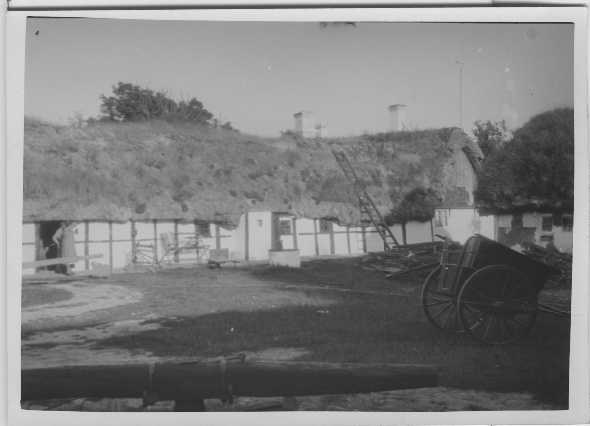 'Akkaexpedition, Bilder från Läsö och från båten (Skandia, FC 51). :: :: Lång gårdsbyggnad med gräs/halmtak, kvinna och man ståendes vid ingången, i förgrunden är bla. en kärra synlig. Stege. :: :: Se fotonr. 5089:53, samma motiv. Ingår i serie 5089:1-63. Se även fotonr 2401-2453.'