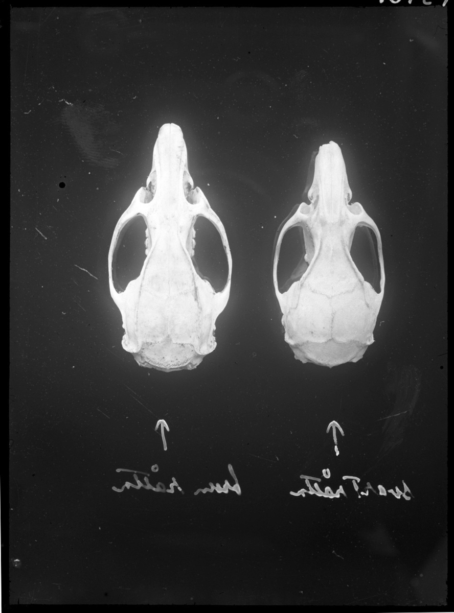 Skallar av svart råtta (högra) och brun råtta (vänstra).
