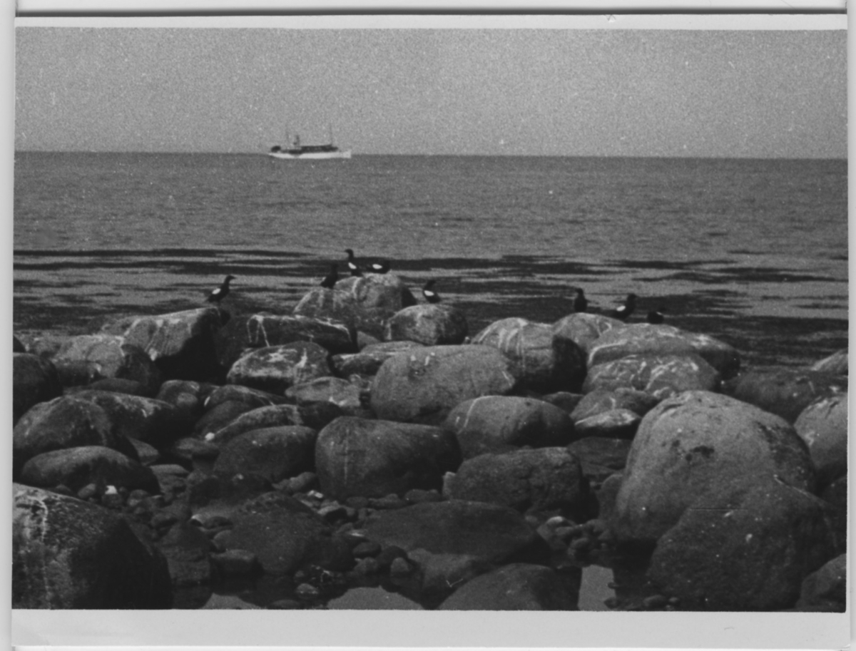 'Biologiska föreningens utfärd till Läsö och Nordre Rönner: :: :: ca 10 st tobisgrisslor på stenblock i förgrunden, vy med båt på avstånd. :: :: Se fotonr. 2674-2734, 2687-2691, 2692-2711, 2714-2734, 2843-2863 och 2975 från samma utfärd.'