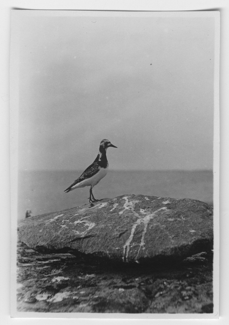 'Roskarl på klippa med exkrementer. Närbild. Vy ut mot öppet vatten, sjön. :: :: Ingår i serie med fotonr. 3495-3511.'
