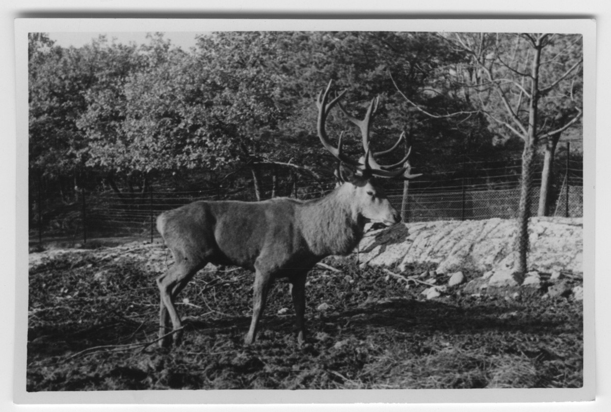 'Kronhjort sedd från sidan, med horn. Hane. :: :: Ingår i serie med fotonr. 4159:1-7 samt 4160:1-5.'