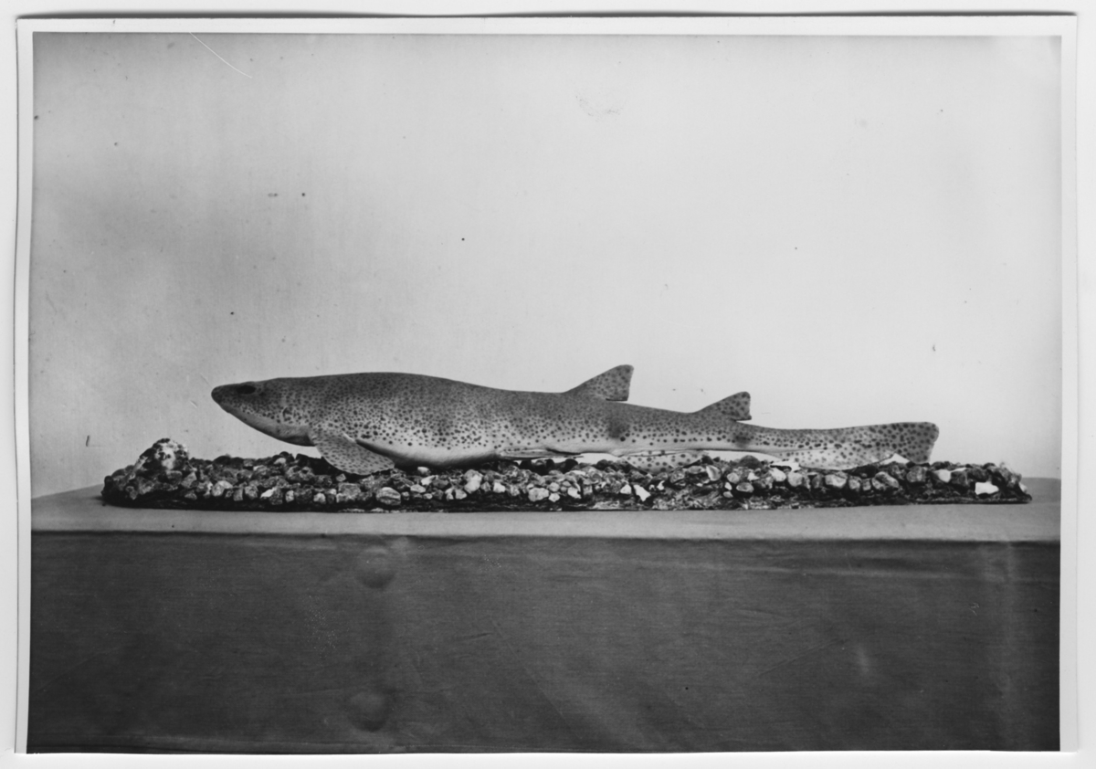 Småfläckig rödhaj. Monterad liggande på grus. Fynddatum: 1954-03-13.