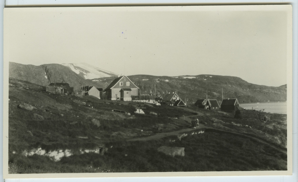 'Vy över byn Upernivik, Vesö-Grönland, sedd från sjukhuset. Vy med klunga med hus med grupp promenerande människor naedanför. I bakgrunden berg. ''Kaersorsuak''berget i bakgrunden. :: :: Ingår i serie Fotonr. 5217:1-103. Se även hela fotonr. 5202-5218 med bilder från Frits Johansen.'