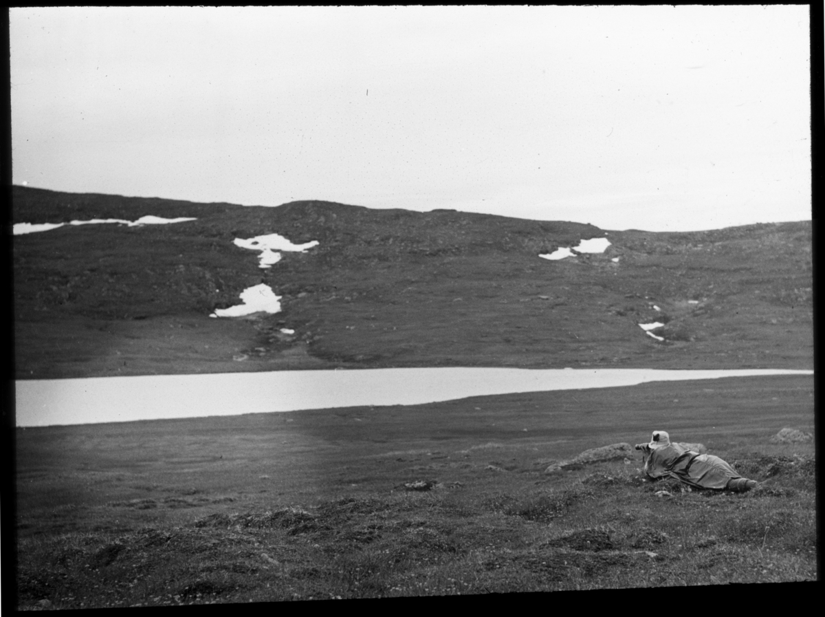 'Bildtext: ''Skärsnäppa väntas ut.'' Vy med sjö, snöklädd berg och till höger i bilder ligger en person med kikare i händerna, iklädd hatt. :: :: Ingår i serie med fotonr. 5166:1-8, numrerade med bildnr 223-230. Se även hela serien med fotonr. 5155-5174.'