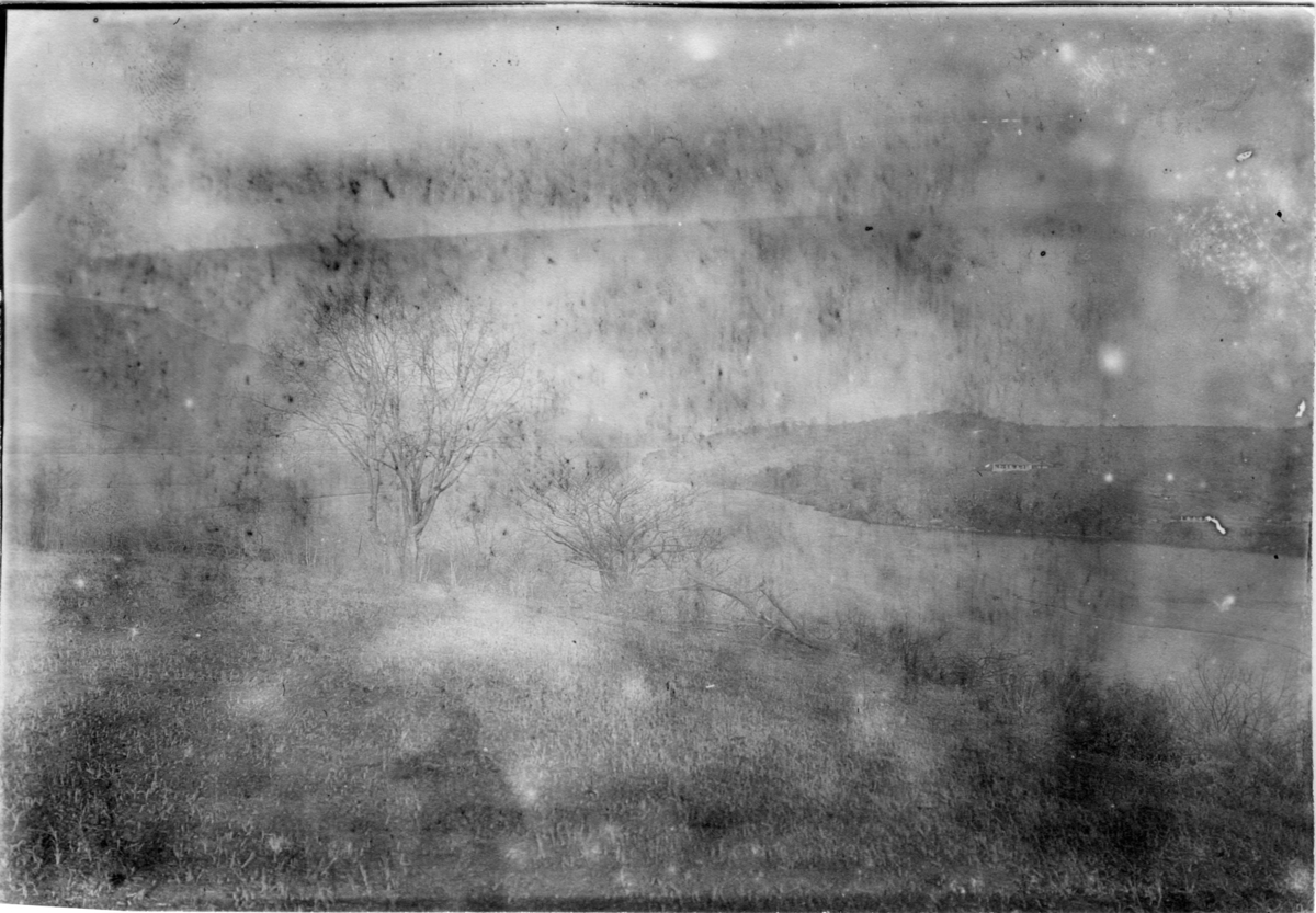 'Diverse fotografier från bl.a. dåvarande Nordrhodesia, nu Zambia, tagna av Konsul Magnus Leijer. :: :: Vy över landskap med träd , berg och vatten. Från långt håll är även byggnader synliga.'