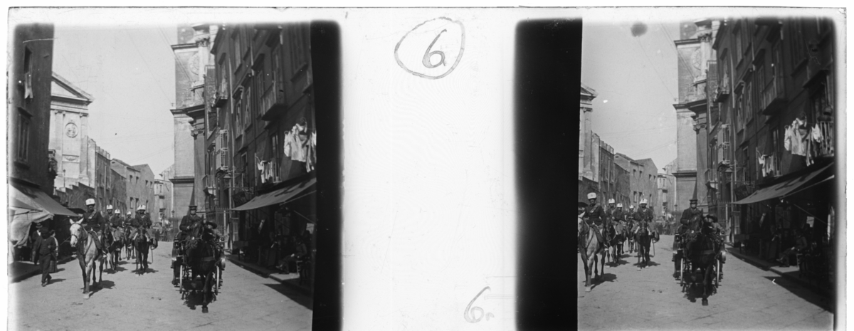 '6 män, ryttare, militär, i uniform och hjälm samt vagn dragen av 1 häst, på gatan med byggnader på sidorna. :: Enligt text till fotot: ''Cavalry patrol.'' :: :: Ingår i serie med fotonr. 5242:1-17, se även hela serien med fotonr. 5237-5267.'