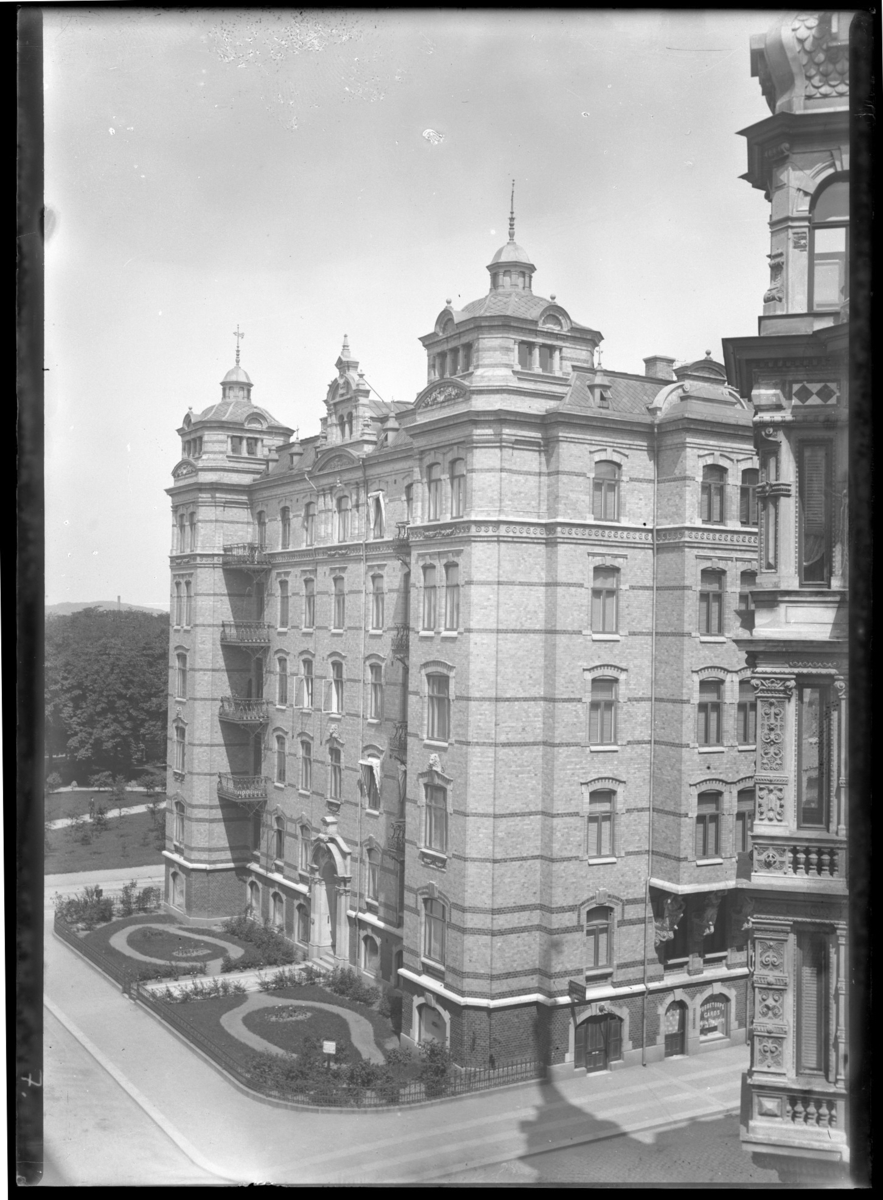 'Vy med husfasaden till en byggnad med 4 våningar med balkonger. Nedanför gångväg på gräsmattsyta, :: :: Ingår i serie med fotonr. 5281:1-13. Se även fotonr. 5269-5292 med bilder från Stuxbergs resa till Kaukasien.'