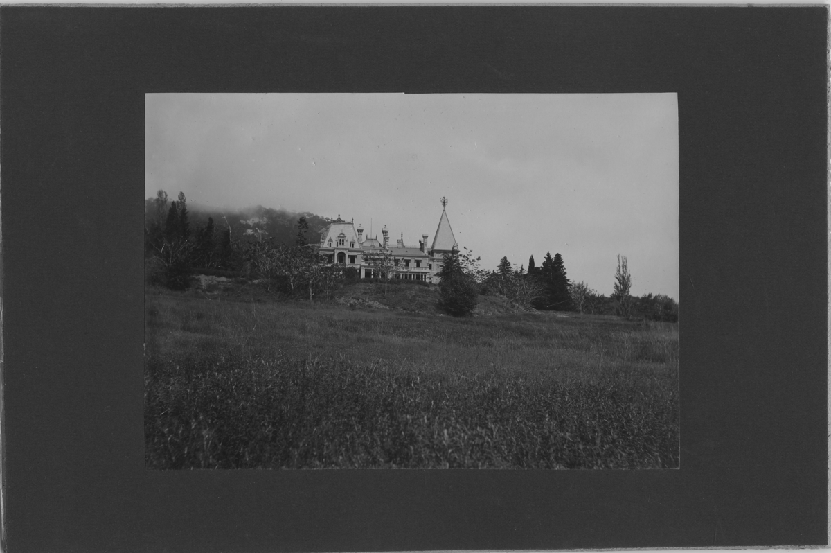 'Vy med öppet fält i förgrunden och bakom buskar och träd en stor byggnad med småtorn. :: :: Se serie med fotonr. 5271:1-15. Serie fotonr 5269-5292, Stuxbergs resa till Kaukasien, 1897.'