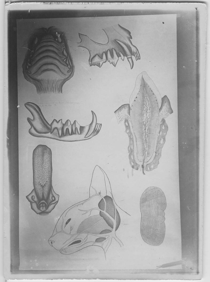 'Teckning över huvud samt käk- och mundelar hos katt. Latinska namn på delar utsatt men svag färg på text. :: :: ''Fotografier använda vid dissektionskursen våren 1928'' . :: Avfotograferade teckningar på skelett och organ. :: På baksidan av vissa står det Kerstin Nyblén :: V.T.-18 :: , ur bok'