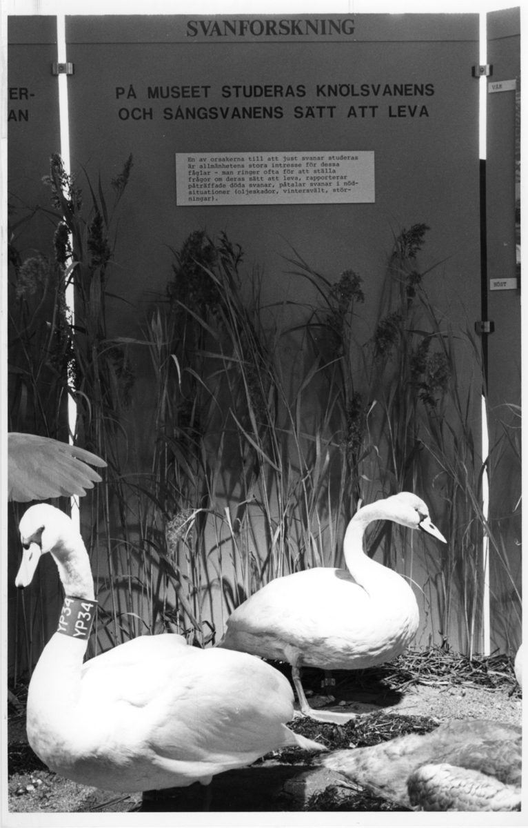 'Foto på Jubileumsutställningen, Göteborgs Naturhistoriska museum 150 år. :: :: Utställningsskärm från svandelen av utställningen, angående varför svanar studeras på museet. Med 2 monterade svanar framför skärmarna.'