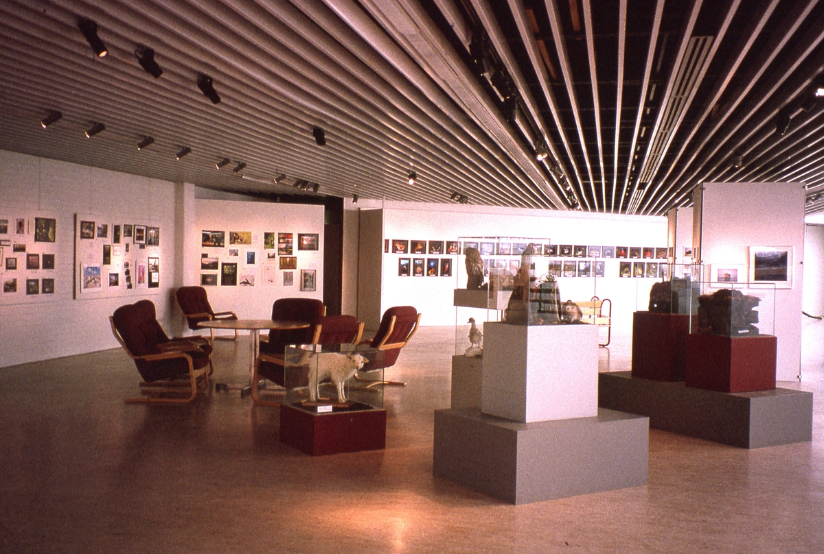 'Utställning ''Fototävling'' på Göteborgs Naturhistoriska museum. :: :: Ca 5 st posters med foton. I förgrunden bord och fåtöljer. :: :: Ingår i serie med fotonr. 6949:1-4.'