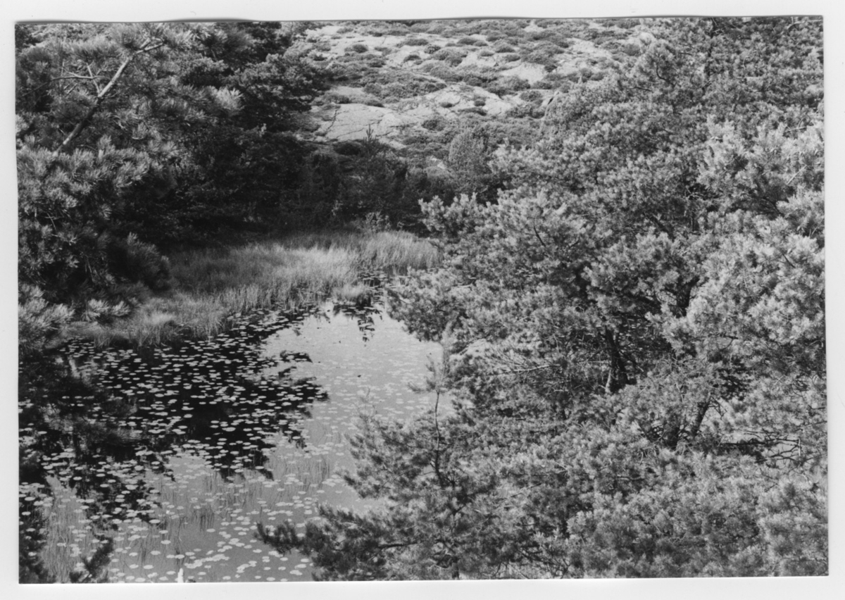 'Bildtext: ''Sjö o hällandskap. Riktning 300.'' :: Sjö med näckrosvegetation och intillväxande furuträd, vid berghäll. :: :: Ingår i serie med fotonr. 6970:1-1125, dokumentation av Hisingens naturgeografi, visande landskapsformerna i stora drag och gjord inför exploateringen av området. Platserna för fotograferingen finns utsatta på karta i skala 1:4000 som finns på Göteborgs Naturhistoriska musem. Fotoriktningen mättes med kompass i gammalgrader.'