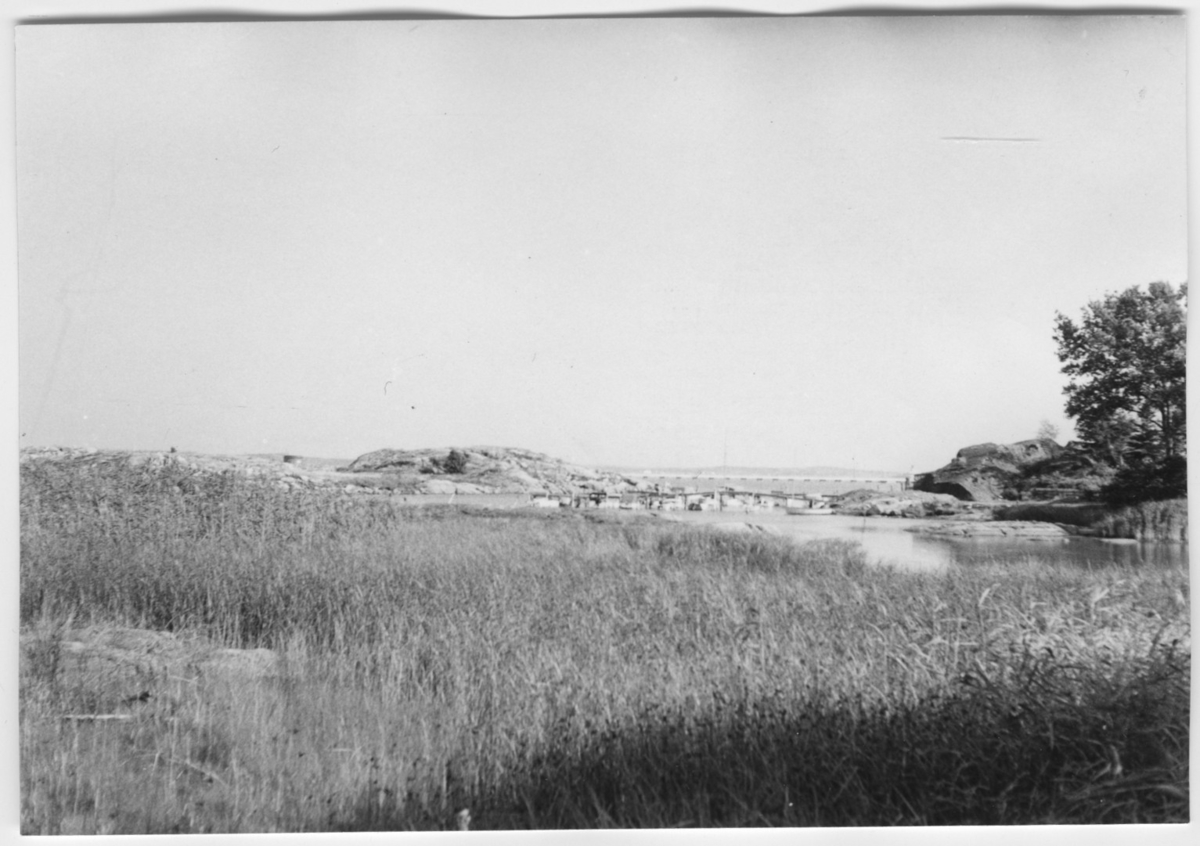 'Bildtext: ''Uppgrundad vassvik med vassvegetation. Riktning 130.'' Skär, berghäll. I bakgrunden syns någon form av förbindelse ut till raffinaderier. :: :: Ingår i serie med fotonr. 6970:1-1125, dokumentation av Hisingens naturgeografi, visande landskapsformerna i stora drag och gjord inför exploateringen av området. Platserna för fotograferingen finns utsatta på karta i skala 1:4000 som finns på Göteborgs Naturhistoriska musem. Fotoriktningen mättes med kompass i gammalgrader.'