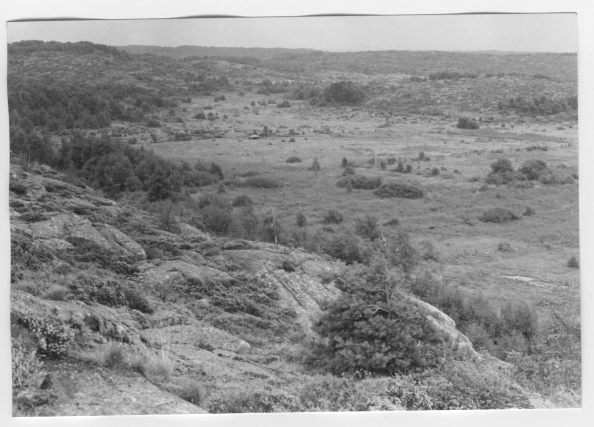 'Bildtext: ''Strandäng. Riktning 44.'' I förgrunden berghäll med lågväxt tall och en. Vy ner över strandängen med viss buskvegetation. I fonden berghällar och nedanför står en bil. :: :: Ingår i serie med fotonr. 6970:1-1125, dokumentation av Hisingens naturgeografi, visande landskapsformerna i stora drag och gjord inför exploateringen av området. Platserna för fotograferingen finns utsatta på karta i skala 1:4000 som finns på Göteborgs Naturhistoriska musem. Fotoriktningen mättes med kompass i gammalgrader.'