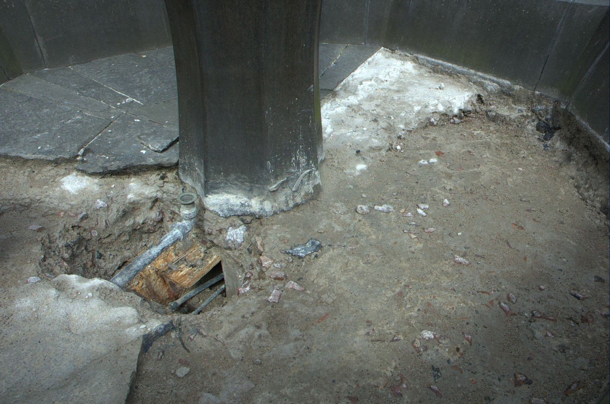 'Fontänen under reparationsarbetet. :: :: Fotonr. 7095 består av en bildserie som dokumenterar diverse utrymmen i byggnaden så som kontor, arbetsplatser, arbetsrum, magasin m.m. Bilder tagna före och efter olika ombyggnationer bl.a.'