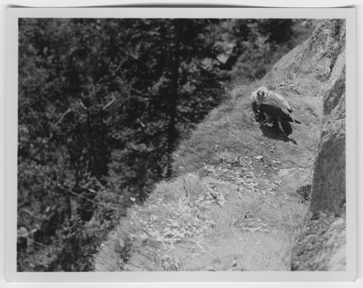 'Pilgrimsfalk med ungar på klipphylla, rovet styckas.Granskog i fonden. :: :: Ingår i serie med fotonr. 1771-1837. Se även fotonr. 3151-3200.'
