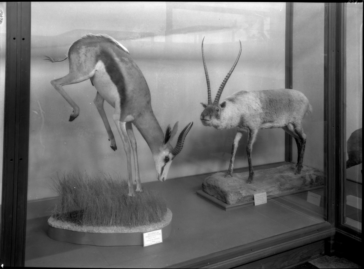 'Till vänster: Monterad springbock. Hane. Fynddatum: 1912-10-15. Fyndplats: Portugisiska Västafrika, Coroca. Monterad av Hilmer Skoog. Gen.kat.nr. 1913-2277. Ma.ex. 829. :: :: Till höger:Tibetansk antilop. Hane. Inkom datum: 1919-00-00. Fyndplats: Kina, Szechuan. Ma.ex. 896. Gen.kat.nr. 1919-3393. :: :: Springbocken finns utställd i monterskåp nr. 53 och tibetanska antilopen i monterskåp nr. 54-55 i däggdjurssalen på Göteborgs Naturhistoriska Museum (2007-10-31). :: :: Ingår i serie med fotonr. 2735-2769.'