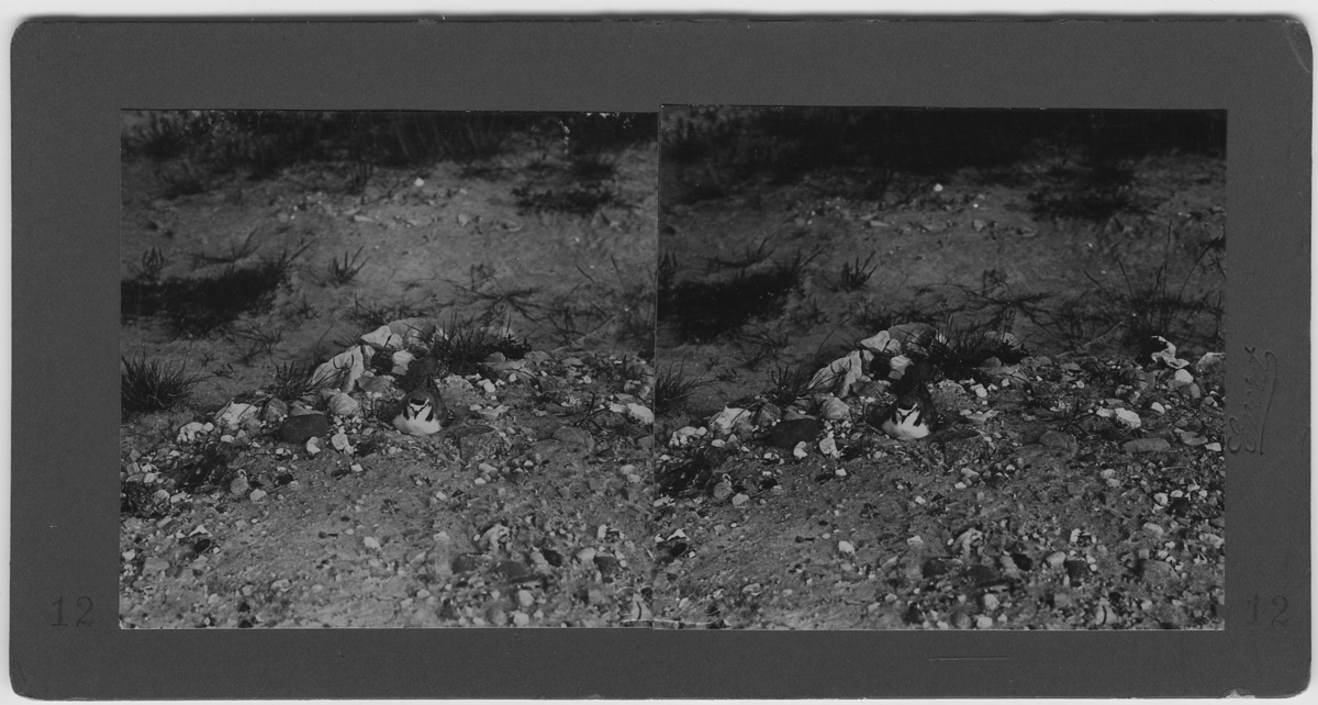 'Svartbent strandpipare i boet. :: :: Ingår i serie med fotonr. 423-434. Stereoskopbilderna är numrerade 1-12 och till dem hör ett kort där det står: stereoskopbilder av danska djur och fåglar i naturen tillhörande djurläkare Roar-Christensen. Nr 1-4 mindre strandpipare, nr. 5-8 större strandpipare, nr. 9-12 svartbent strandpipare.'