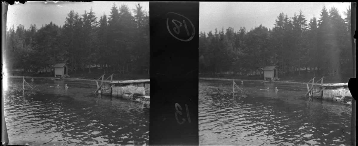 'Bildtext: ''Lofthus: Bathing beach.'' :: 2 personer badande invid en brygga. På land litet skjul med trappa och spång ner till vattnet (ev. omklädningsstuga). :: :: Ingår i serie med fotonr. 5249:1-20, se även hela serien med fotonr. 5237-5267.'