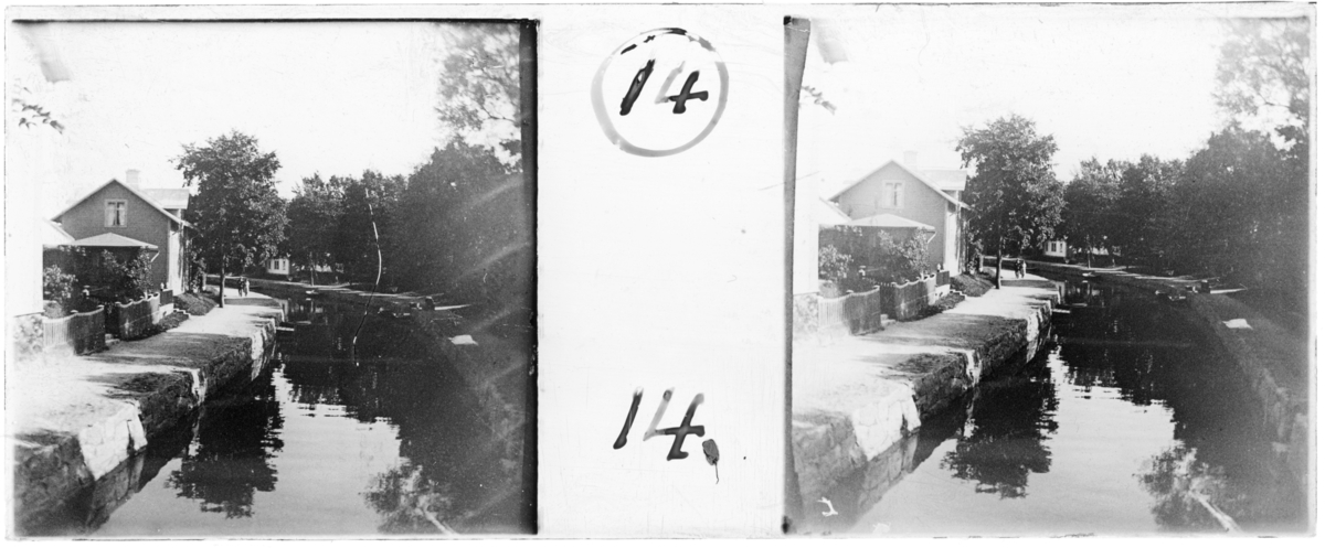 'Bildtext: ''Trosa, river.'' (Göta kanal vid Trosa) :: Vy med kanal och hus med trästaket, 2 personer promenerar längs kanalen. :: :: Ingår i serie med fotonr. 5250:1-21, se även hela serien med fotonr. 5237-5267.'
