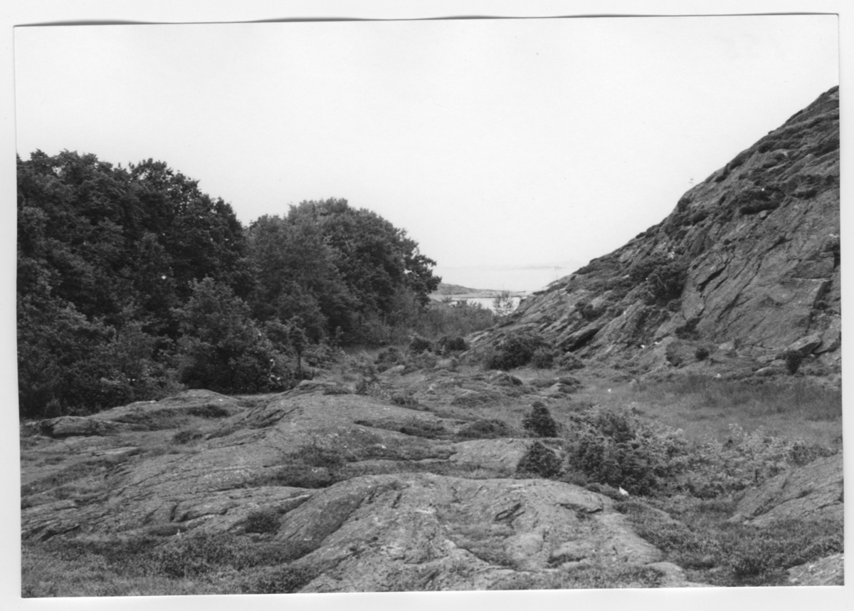 'Bildtext: ''Dalgång. Vegetation i läläge. Riktning 356.'' Vy med berghäll och enbuskar. :: :: Ingår i serie med fotonr. 6970:1-1125, dokumentation av Hisingens naturgeografi, visande landskapsformerna i stora drag och gjord inför exploateringen av området. Platserna för fotograferingen finns utsatta på karta i skala 1:4000 som finns på Göteborgs Naturhistoriska musem. Fotoriktningen mättes med kompass i gammalgrader.'