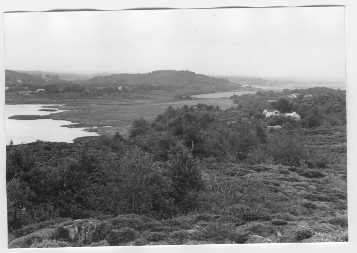 'Bildtext: ''Havsvik med strandäng. Riktning 66.'' I förgrunden berghäll med låg trädvegetation. Vy med havsviken och på avstånd hus. Öppet fält i anslutning till strandängen. :: :: Ingår i serie med fotonr. 6970:1-1125, dokumentation av Hisingens naturgeografi, visande landskapsformerna i stora drag och gjord inför exploateringen av området. Platserna för fotograferingen finns utsatta på karta i skala 1:4000 som finns på Göteborgs Naturhistoriska musem. Fotoriktningen mättes med kompass i gammalgrader.'