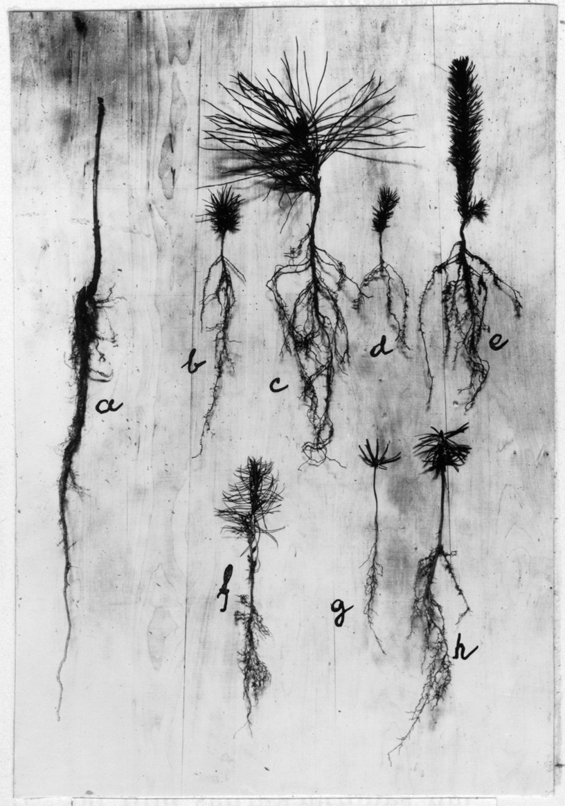 'Bildtext: ''Bild 45. Plantor: Ek, tall, gran och lärk och silvergran.'' :: :: Fotonr. 7046:307-328 indelade som ''Skogsodling och självsådd.'' Ingår i serie med fotonr. 7046:1-383, 7047:1-33 och 7048:1-67 med bilder från Länsjägmästare John Lindners bildarkiv.'