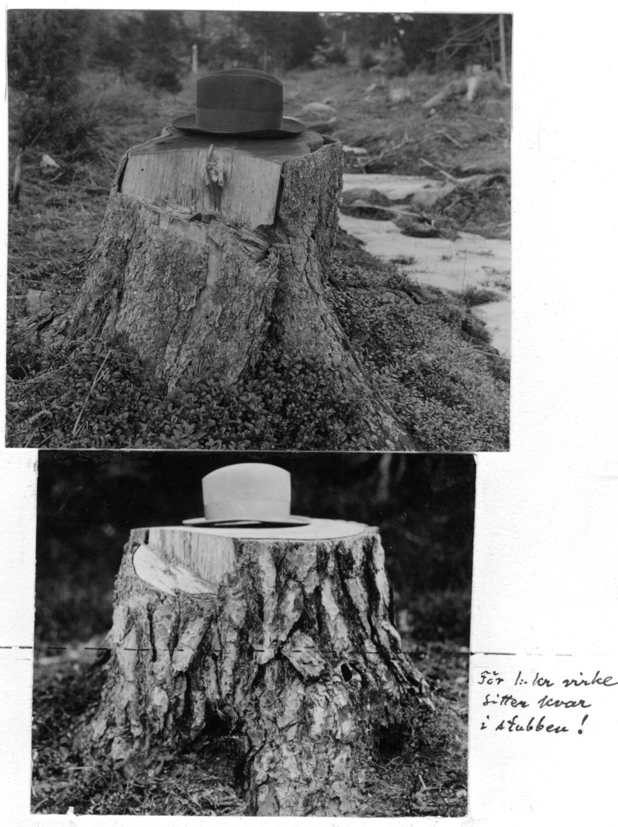 'Bildtext: ''För 1 kr virke sitter kvar i stubben.'' ''Trädfällning.'' Bilder på 2 stubbar, hatt liggande på övre stubben. :: :: Fotonr. 7046:335-353 indelade som ''Skogsavverkning och virkestransport.'' Ingår i serie med fotonr. 7046:1-383, 7047:1-33 och 7048:1-67 med bilder från Länsjägmästare John Lindners bildarkiv.'