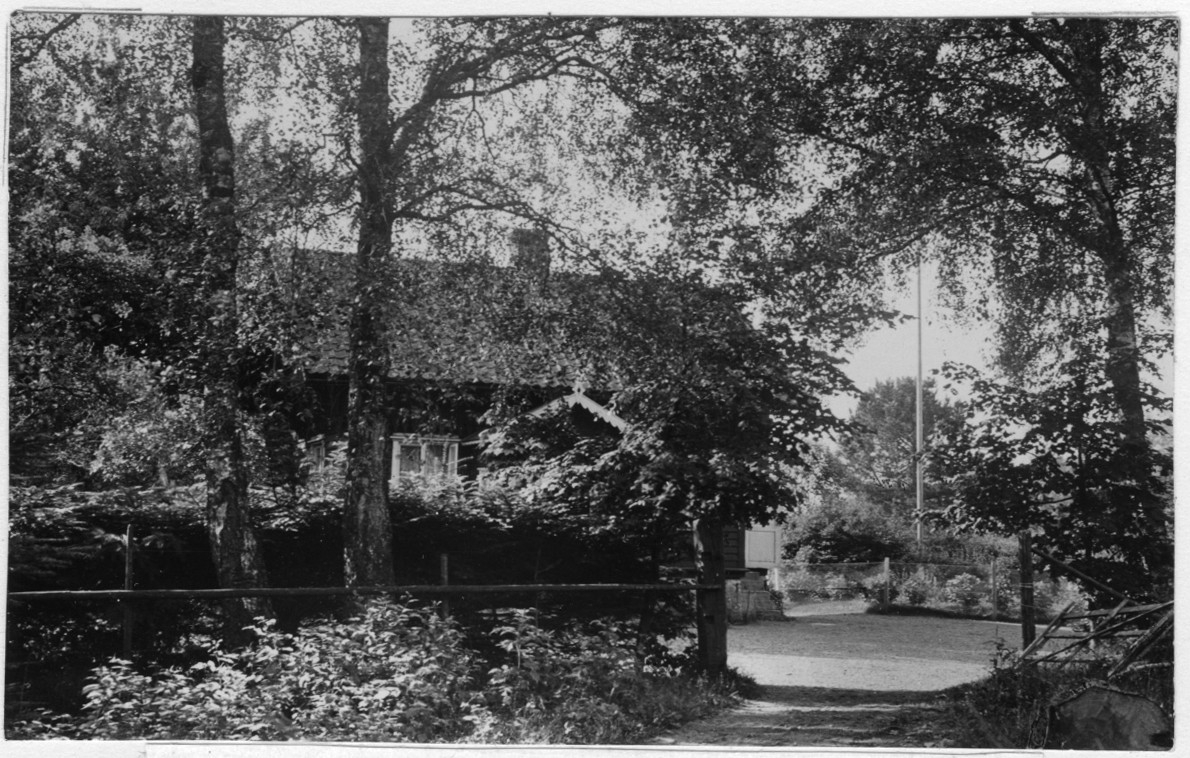 'Bildtext: ''F.d. Hushållningssällskapets skogsplantörsboställe.'' Litet trähus med flaggstång, i förgrunden träd och staket. :: :: Fotonr. 7048:47-58 indelad under rubriken ''Skogsskötselns administration i Göteborgs och Bohus län''. Ingår i serie med fotonr. 7046:1-383, 7047:1-33 och 7048:1-67 med bilder från Länsjägmästare John Lindners bildarkiv.'