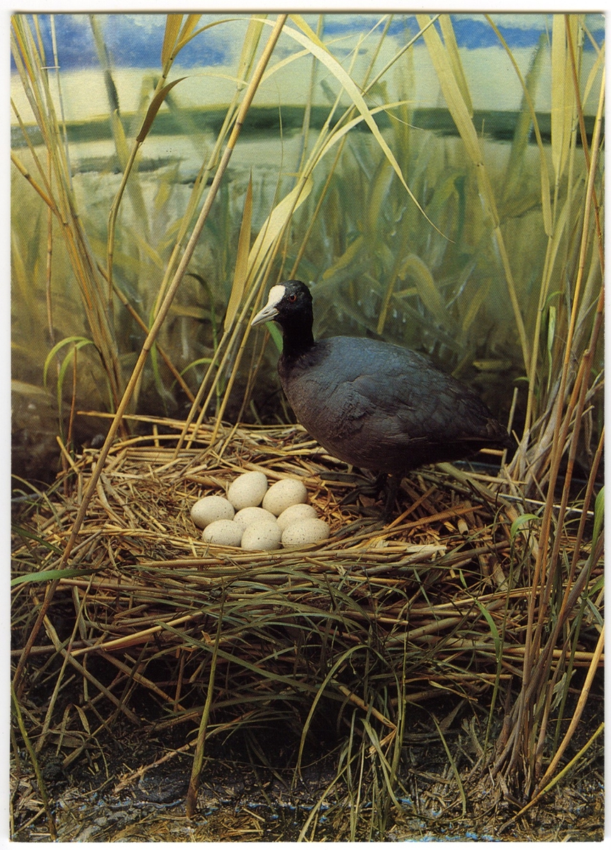 'Ingår i en serie med Fotonr. 5419 med Göteborgs Naturhistoriska museums olika vykort genom åren. :: :: Monterad sothöna på boet med 8 st ägg.'
