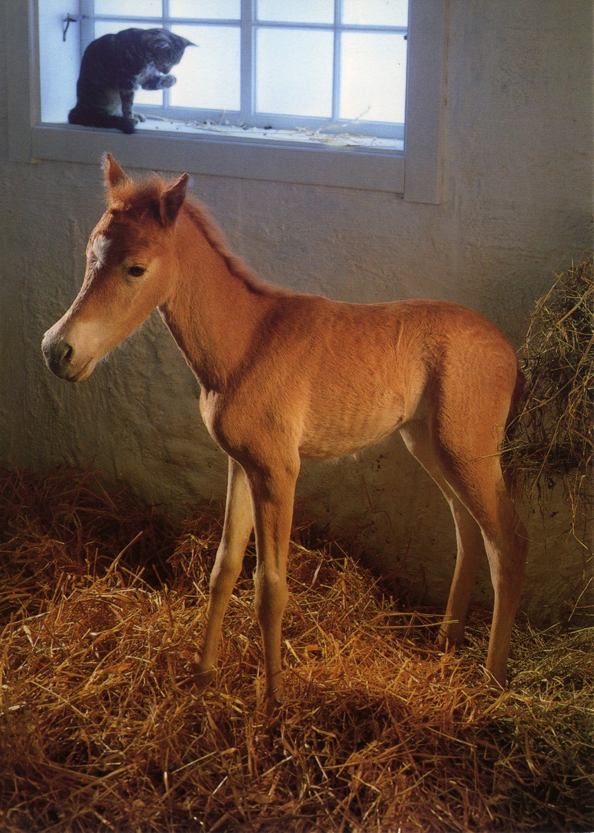'Ingår i en serie med Fotonr. 5419 med Göteborgs Naturhistoriska museums olika vykort genom åren. :: :: Ett av Jeanette Setterberg monterat gotlandsrussföl, i stallmiljö med tass-slickande katt i bakgrunden.'