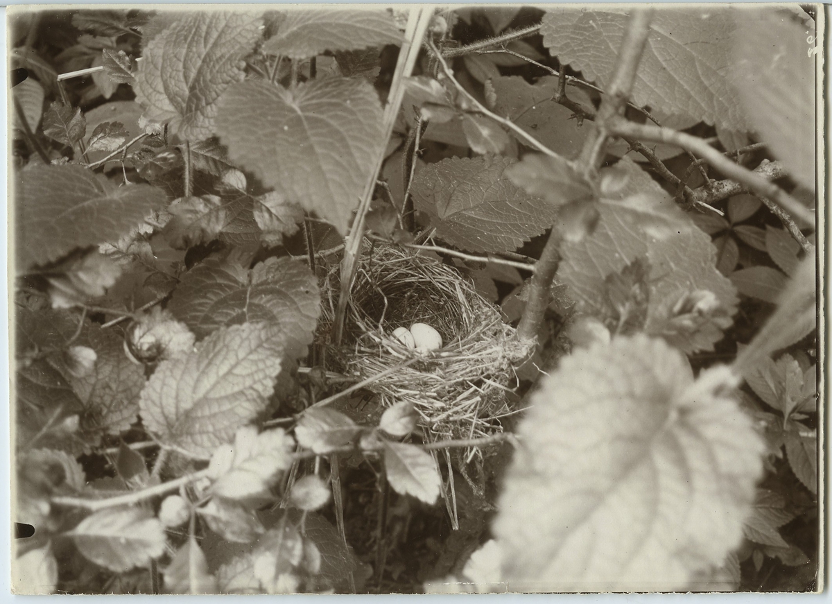 Svarthätta, bo med 3 st ägg. Närbild med busk- och örtvegetationen.