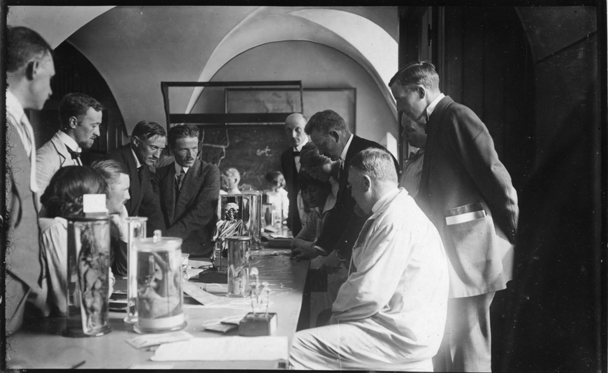 'Från ''Sommarkursen - dissektionsövningar'' på gamla museet på Östra Hamngatan. Kursdeltagarna i arbete i källarvåningen, med Leonard Axel Jägerskiöld främst till höger. Ca 15-20 män och kvinnor samlade kring ett långt bord med glasbehållare med preparat. :: :: Ingår i serie med fotonr. 737-740.'