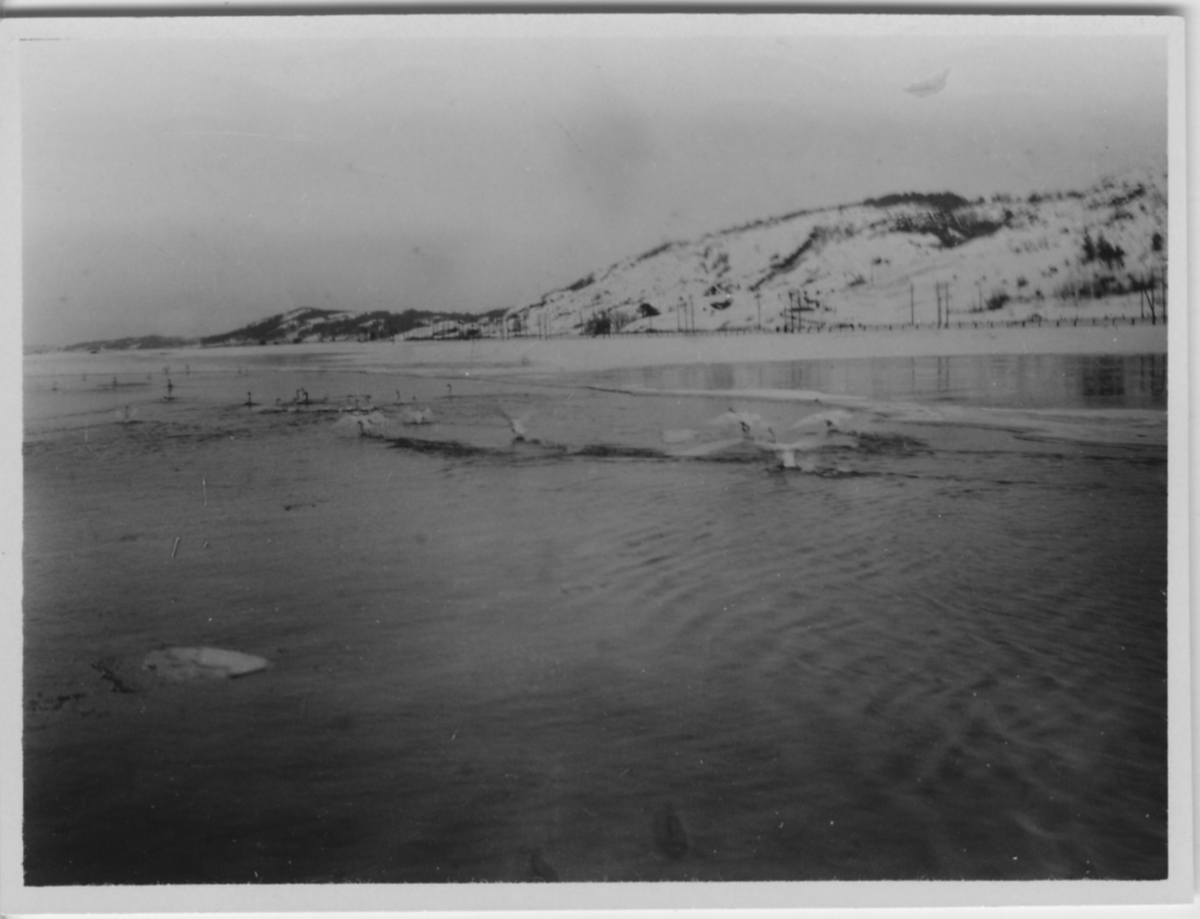 'Svanar i vattnet vid Bohus: :: Vy över öppet vatten med is invid älvstranden nedanför sluttning. :: :: Ingår i serie med fotonr. 1490-1493.'