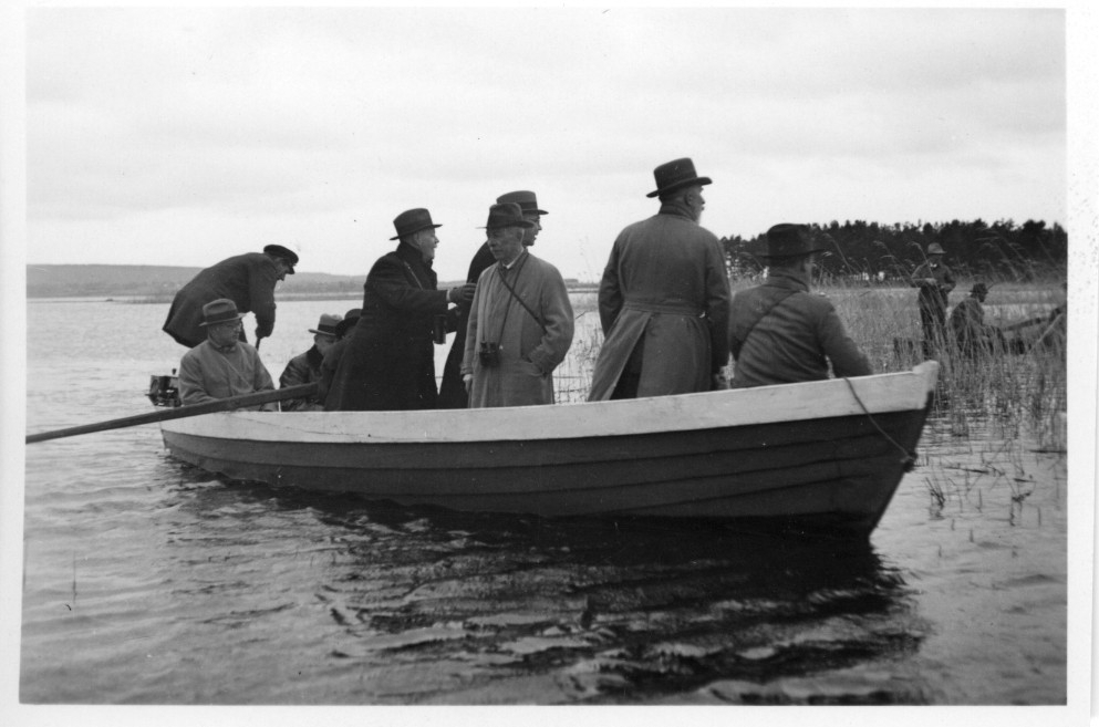'Biologiska föreningens utfärd till Tåkern, Vadstena m.fl. platser: :: :: 9 män stående och sittande i en eka. 2 män i bakgrunden i en annan eka inne i vassvegetation. :: :: Se fotonr. 3588-3634 samt 3661-3677.'