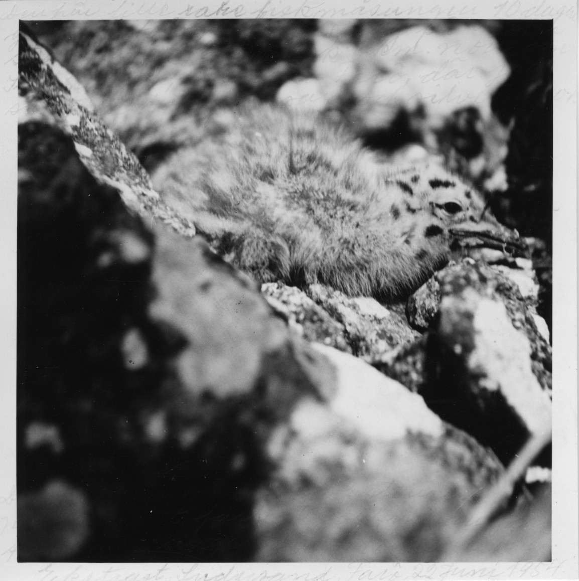 'Enligt anteckning på fotografiets baksida: :: ''Den här lille rare fiskmåsungen 10 dagar gammal fotograferad jag på västra stranden av Eketräsk 3 km norr om Sudersand, Nordöstra Fårö, där jag såg 5 par dvärgmåsar och silvertärnor.Den sitter tryckt mellan 2 stenar. Jag hade ett farligt jobb, innan jag fick tag i ungen för fotografering.'' :: :: Ingår i en serie med fotonr. 4512:1-57 med diverse foton av fågelbon med ägg och ungar. Varje fotografi har utförliga anteckningar på sin baksida, kopierade från framsidan, spår av de på framsidan är fortfarande synliga.'