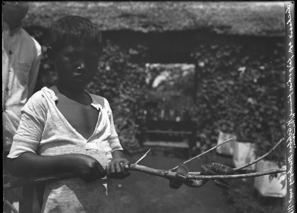 'Bildtext: ''Lachesis sp., färgskiss finns.'' 1 pojke håller en gren med 1 orm i handen. I bakgrunden ytterligare 1 person och byggnad. :: :: Ingår i serie med fotonr. 5122:1-4.'