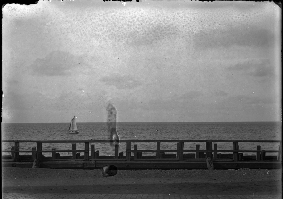 'Vy ut mot havet med 1 segelbåt. Någon form av förstärkningsvall med träräcke i förgrunden, mot havet. :: :: :: Ingår i serie med fotonr. 5139:1-36. Fotonr. 5139:1-17 ligger i en ask med texten ''med motiv från (enligt pappasken) Helgoland. För diapositiv.'' Fotonr. 5139:18-27 ligger i en pappask med texten: ''Helgoland (''Augusta'')'' en del för diapositiv. Fotonr. 5139:28-36 ligger i en ask med texten ''Dubbletter från Helgoland. Dessutom diapositiv från Kristineberg och Lysekil.'''