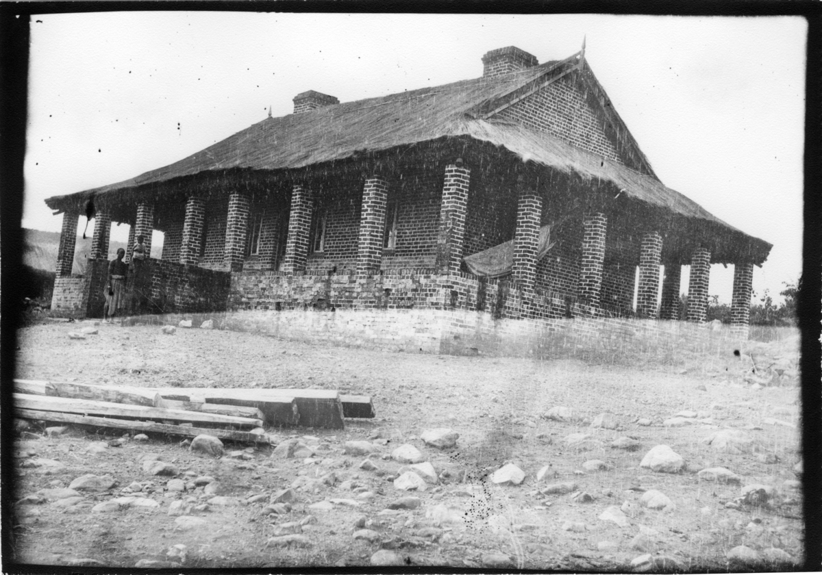 'Diverse fotografier från bl.a. dåvarande Nordrhodesia, nu Zambia, tagna av Konsul Magnus Leijer. :: :: En man stående vid sidan av en trappa till en tegelbyggnad med veranda, teglade pelare och halmtak, fotograferad från sidan. Bredvid honom sitter ett barn.'