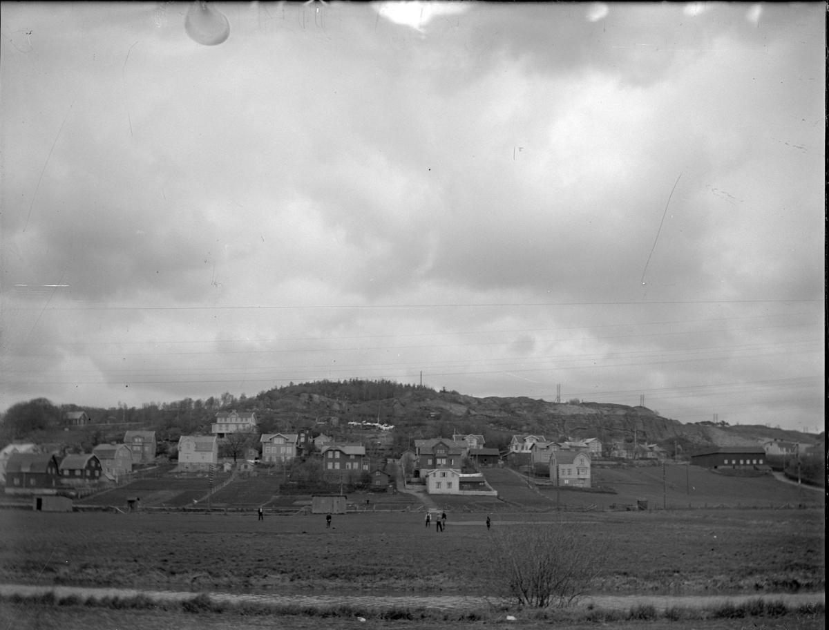 'Bildtext: ''Idrotsplan Mölndal.'' :: Vy över del av Mölndal, med idrottsplan i förhrunden. Människor på planen. Små träbodar i kanten av planen. I bakgrunden hus och berg i fonden. :: :: Ingår i serie med fotonr. 5228:1-11.'