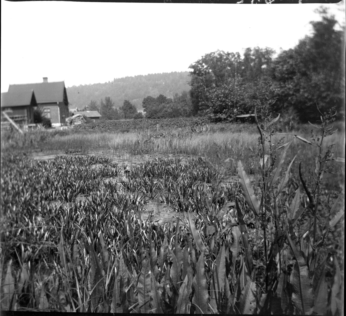 'Vy med hus på avstånd, i förgrunden kärr. :: :: Plåten låg i pappask tillsammans med 2 olika kuvert med texterna: ''Katrineholm samskola.'' resp. ''Från Stratiotes-kärret, Rosendala. 5 plåtar. Den 11 juli 1906.'' Är troligtvis den senare texten som passar in på plåten. :: :: Ingår i serie med fotonr. 5416:1-15.'