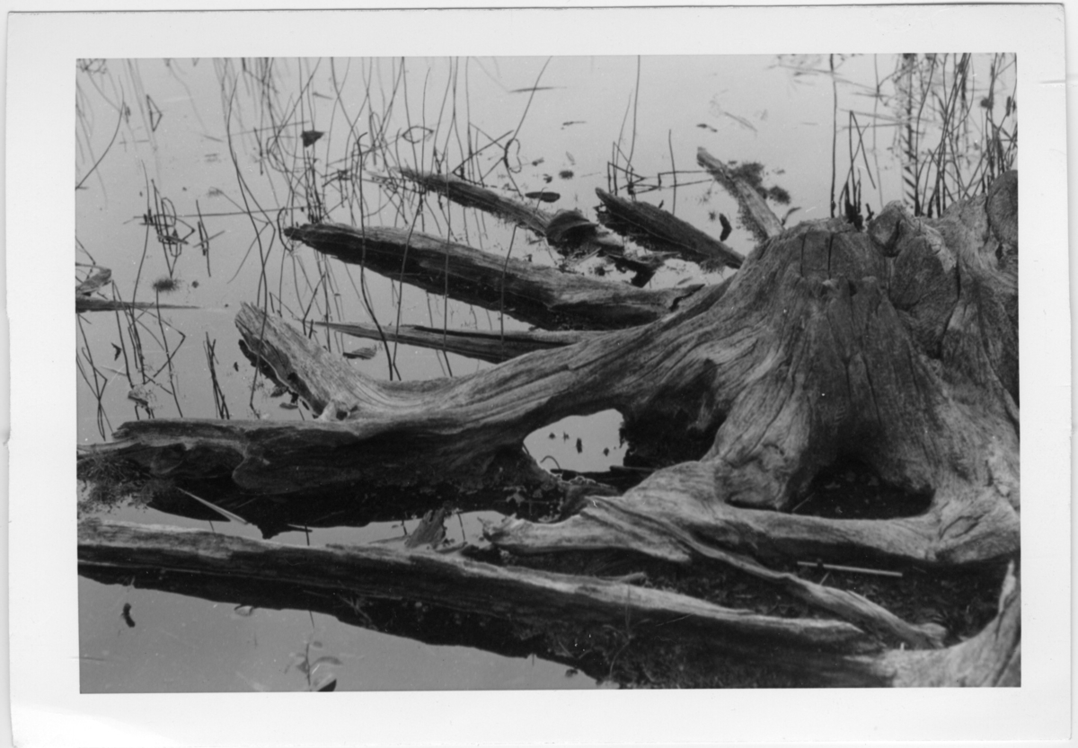 'Närbild på 5000-årig, subfossil tallstubbe i sjö. En stubbe finns monterad på väggen på entréplan på Göteborgs Naturhistoriska museum. :: :: Ingår i serie med fotonr. 7051:1-8, se även fotonr 4709 - 4714.'