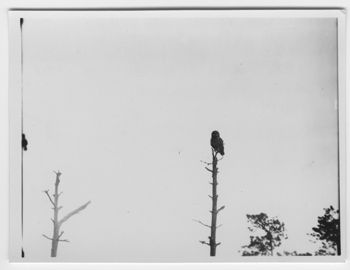 'Vy med 2 torraker, jorduggla sittand ei toppen på den högra. :: :: Ingår i serie med fotonr. 3290-3307.'