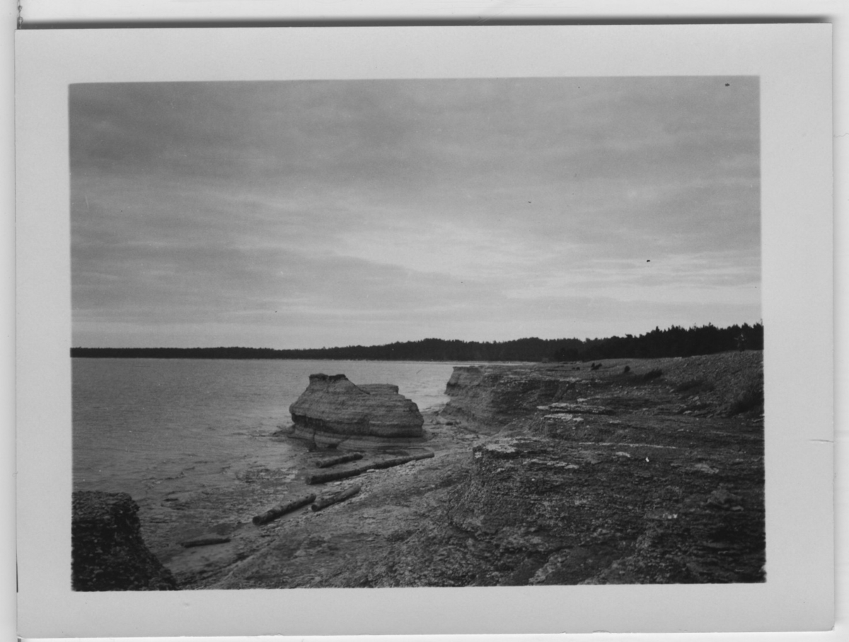 'Biologiska föreningens utfärd till Öland: :: :: ''Raukar vid Byrum, Ölands västkust.'' Vy med raukar, ut mot havet med stockar liggande på strandkanten. Skogsklädd strandkant i bakgrunden. Samma vy som fotonr. 2593. :: :: Se även fotonr. 2607-2625, 2583-2606 samt 2883-2911 från samma utfärd.'