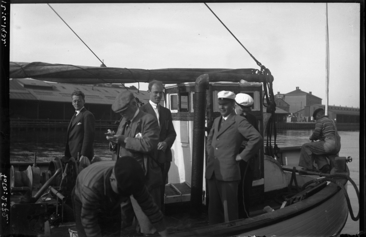 'Kattegattexp: ''Skandia'' lämnar Göteborgs fiskhamn. :: 7 st män ombord, på Skandias däck. Från vänster: Sune Swärd, Leonard Axel Jägerskiöld (med pipa), Romdal, A. Sandell, Harald Alander .'